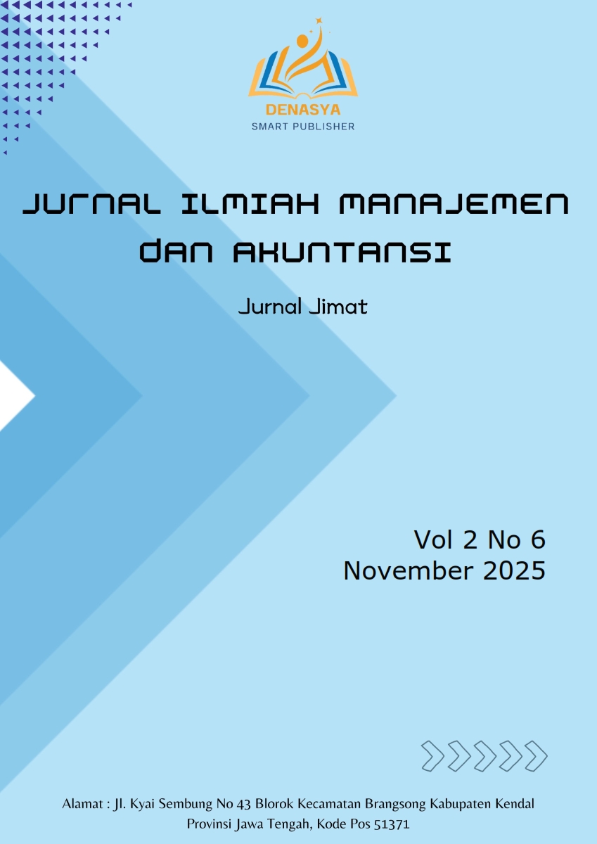 Vol. 2 No. 6 (2025)Jurnal Ilmiah Manajemen dan Akuntansi (JIMAT) dengan e-ISSN : 3047-2032, p-ISSN : 3047-2792 adalah jurnal yang ditujukan untuk publikasi artikel ilmiah yang diterbitkan oleh Denasya Smart Publisher. Jurnal ini berfokus pada penerbitan artikel berkualitas tinggi yang didedikasikan untuk semua aspek penelitian, masalah, dan perkembangan terbaru di bidang Ilmu Manajemen dan Akuntansi. Topik dalam Jurnal ini berkaitan dengan aspek apapun dari manajemen dan Akuntansi, namun tidak terbatas pada topik berikut : Manajemen Sumberdaya Manusia , Manajemen Keuangan, Manajemen Pemasaran, Manajemen Sektor Publik, Manajemen Operasional, Manajemen Rantai Pasokan, Corporate Governance, Etika Bisnis, Akuntansi Manajemen, Perpajakan Pasar Modal dan Investasi, Manajemen Pariwisata. Jurnal ini terbit 1 tahun 6 kali (Januari, Maret, Mei, Juli, September dan November)