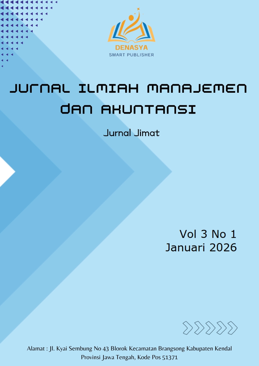 Vol. 3 No. 1 (2026)Jurnal Ilmiah Manajemen dan Akuntansi (JIMAT) dengan e-ISSN : 3047-2032, p-ISSN : 3047-2792 adalah jurnal yang ditujukan untuk publikasi artikel ilmiah yang diterbitkan oleh Denasya Smart Publisher. Jurnal ini berfokus pada penerbitan artikel berkualitas tinggi yang didedikasikan untuk semua aspek penelitian, masalah, dan perkembangan terbaru di bidang Ilmu Manajemen dan Akuntansi. Topik dalam Jurnal ini berkaitan dengan aspek apapun dari manajemen dan Akuntansi, namun tidak terbatas pada topik berikut : Manajemen Sumberdaya Manusia , Manajemen Keuangan, Manajemen Pemasaran, Manajemen Sektor Publik, Manajemen Operasional, Manajemen Rantai Pasokan, Corporate Governance, Etika Bisnis, Akuntansi Manajemen, Perpajakan Pasar Modal dan Investasi, Manajemen Pariwisata. Jurnal ini terbit 1 tahun 6 kali (Januari, Maret, Mei, Juli, September dan November)